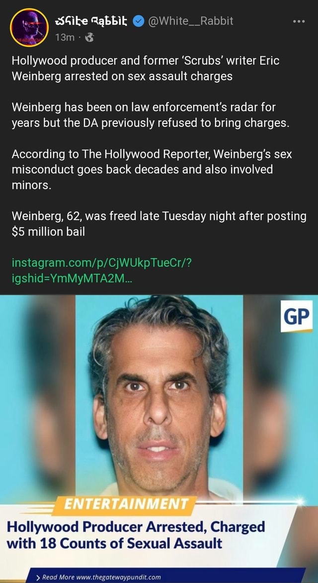 13 hours agoThis undated photo provided by the Los Angeles Police Department shows TV producer Eric Weinberg who was arrested Tuesday Oct. He was taken into custody on Thursday July 14 by the Los Angeles. A Hollywood writer and former co-producer of Scrubs has been charged with sexually assaulting five women in six years the Los Angeles County district attorney said.